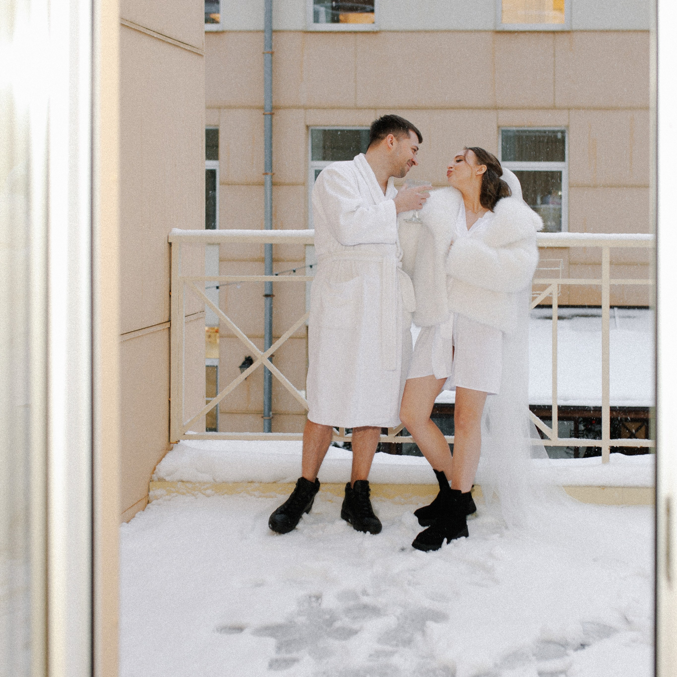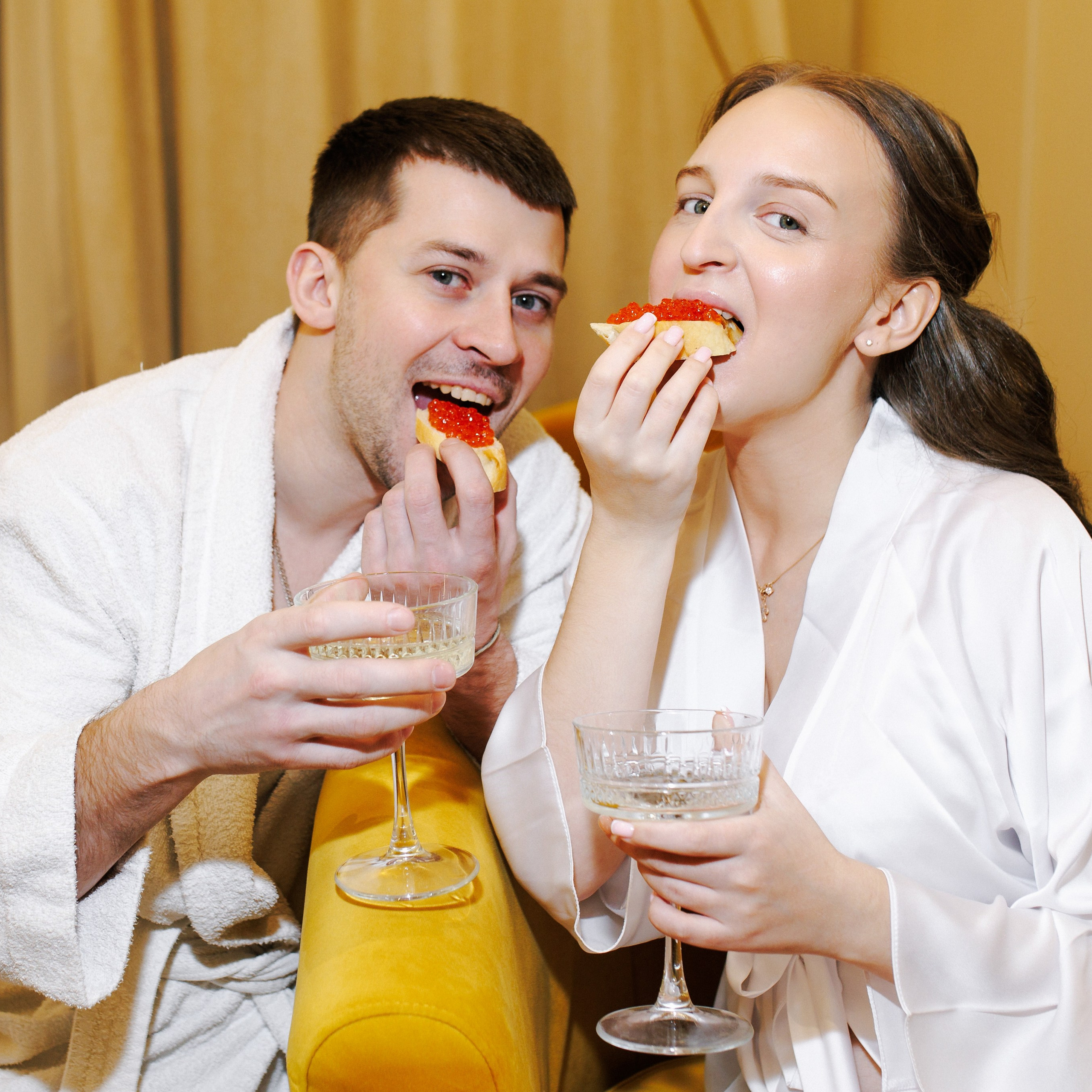 Я всегда радуюсь, когда мои клиенты так готовятся к своему дню. Ребята просто молодцы! Мы начали с утренних съемок жениха и невесты, пофотографировались в халатах, насладились красной икрой и много дурачились и смеялись! 😄📸